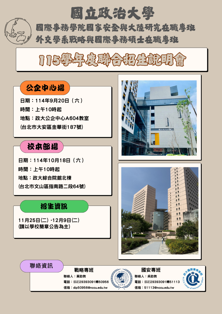 政治大學「國家安全與大陸研究碩士在職專班」以及「外交學系戰略與國際事務碩士在職專班」115學年度聯合招生說明會Post author:東華附小研究出版組Post published:2025 年 9 月 22 日Post category:未分類 Post Views: 23相關內容【轉知競賽訊息】114年第八屆花蓮蘭亭大會全國賽2025 年 3 月 20 日轉知有關軍公教人員退撫基金提撥費率自民國111年1月1起調整為14%一案2021 年 12 月 23 日東華附小10/16校慶運動會取消辦理公告2021 年 9 月 23 日