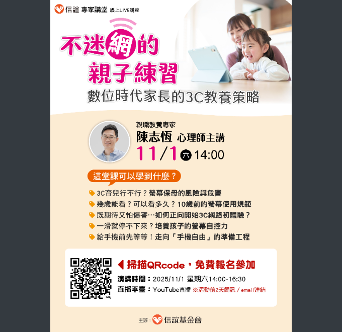 一、信誼將於2025年11月1日(六)下午2:00-4:30舉辦【不迷「網」的親子練習:數位時代家長的3C教養策略】線上LIVE 講座,邀請家長免費報名參加。