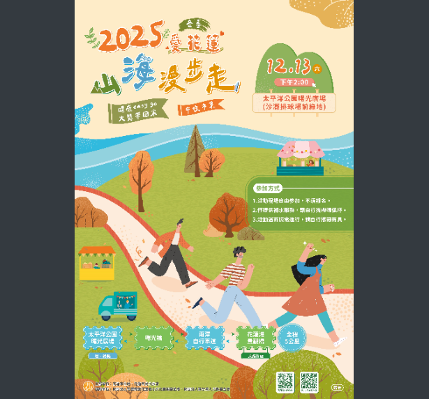 2025 冬季「愛花蓮.山海漫步走」Post author:efshlc321Post published:2025 年 10 月 31 日Post category:學務處 / 訓育組一、花蓮市公所藉由辦理健走活動,培養市民運動風氣,提升戶外運動意願,享受與家人、朋友一起在自然清新的空氣下運動,除能增進情感凝聚,更能建立健康、快樂的生活方式。二、活動資訊:(一)時間:114年12月13日(週六)下午2時。(二)地點:太平洋公園曙光廣場(北濱沙灘排球場前綠地)。(三)更多活動資訊請至花蓮市文化觀光資訊網查詢(https://reurl.cc/rKdV3r)。 Post Views: 112相關內容國家海洋研究院2023「海洋薪傳Ocean Festival」全國兒童海洋繪畫比賽2023 年 3 月 1 日實踐大學推廣教育部高雄中心開設國小暑期營隊活動2022 年 6 月 21 日新北市政府辦理113年新北市客家義民爺文化祭~「義起鬧客家」「HAKKA畫客家」彩繪比賽2024 年 7 月 18 日