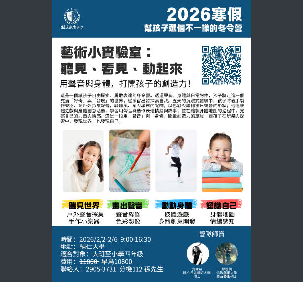 一、為協助教職員於寒假期間提供子女適齡且具創意啟發之活動,辦理冬令營,以感官探索與藝術創作為主軸,內容包含聲音採集、色彩創作、肢體遊戲與自我感知等活動,期能促進學童表達力與創造力。