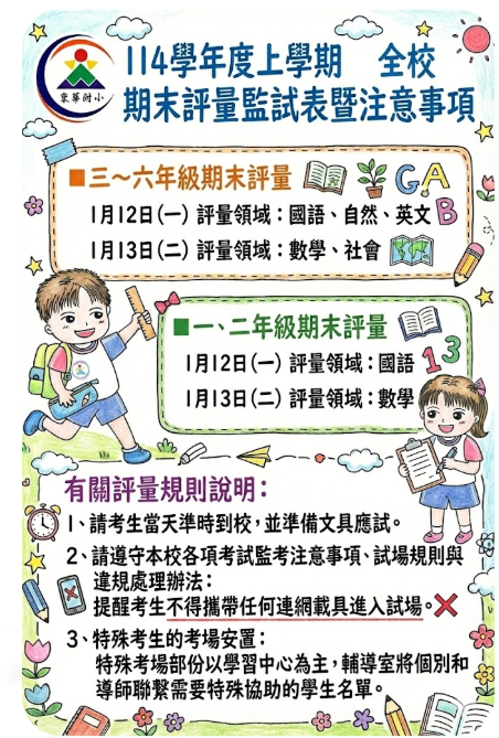 114學年度上學期一~六年級 期末評量注意事項Post author:efshlc314Post published:2026 年 1 月 2 日Post category:註冊組 / 評量 Post Views: 38相關內容【注意】本校113學年度新生登記通知已於3/7(四)寄出至孩子所屬之戶籍地2024 年 3 月 7 日【縣府來文轉知】函轉內政部移民署辦理「111學年度新住民及其子女培力與獎助(勵)學金計畫」1份,請鼓勵符合資格者踴躍報名。2022 年 11 月 8 日113學年度上學期期末受獎名單暨彩排頒獎注意事項(教務處)2025 年 1 月 15 日