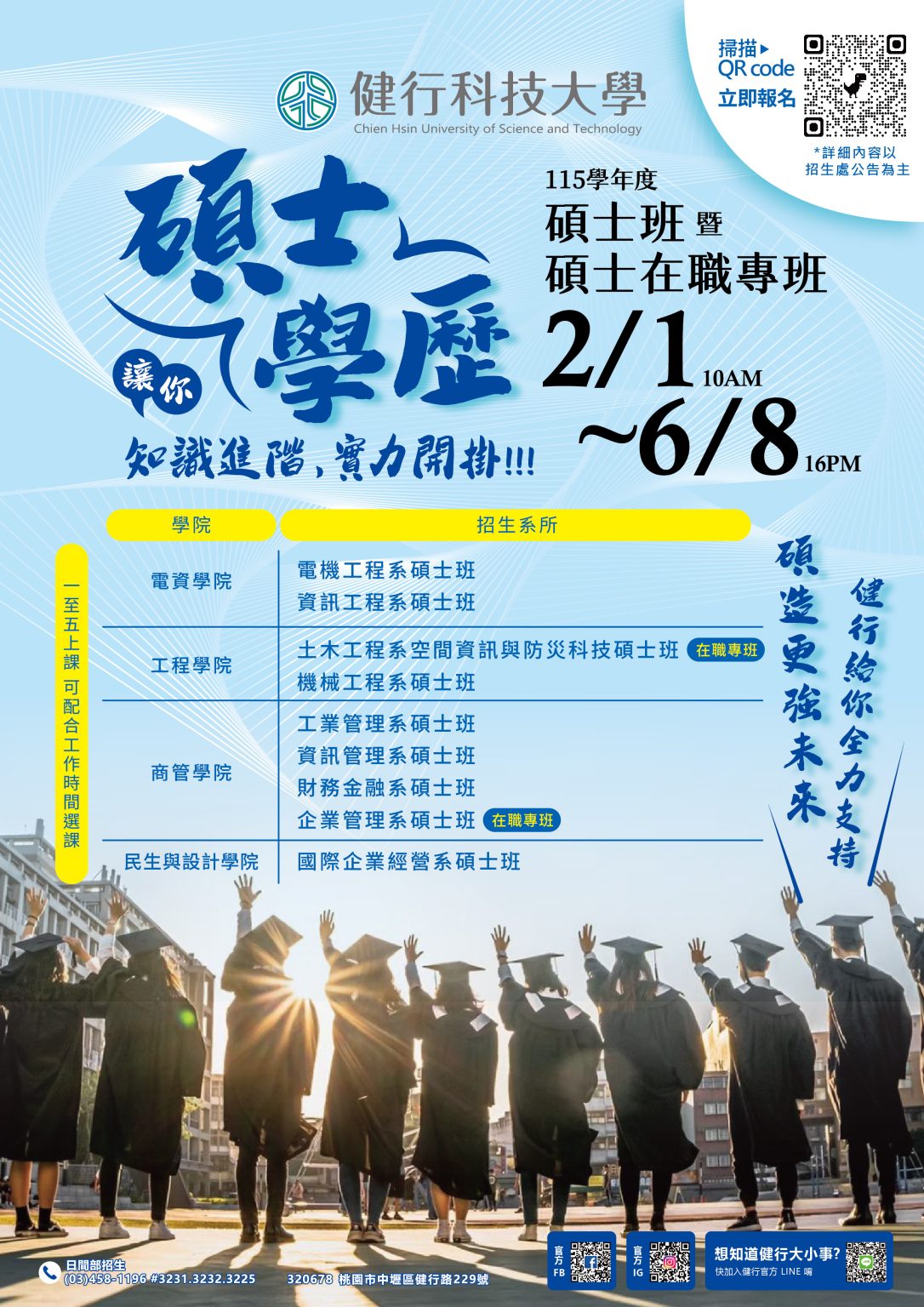 健行科技大學115學年度碩士班暨碩士在職專班考試入學招生Post author:東華附小研究出版組Post published:2026 年 1 月 9 日Post category:未分類 Post Views: 5相關內容轉知臺灣漁業經濟發展協會「漁村優秀原住民學生獎學金實施要點」,請符合申請資格的學生自即日起至110年12月31日止(郵戳為憑),自行向漁會提出申請。2021 年 12 月 5 日【轉知競賽訊息】國立臺灣師範大學辦理113年度「Cool English 英聽王」比賽,鼓勵踴躍報名參加。2023 年 12 月 15 日轉知勞工自願提繳勞工退休金制度宣導措施(影音資訊及懶人包)2022 年 11 月 20 日