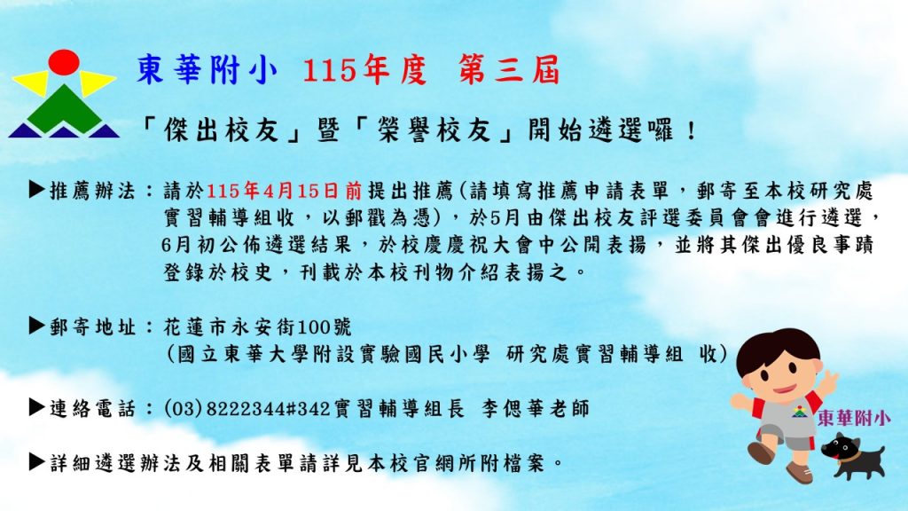 東華附小115年第三屆「傑出校友」暨「榮譽校友」開始報名囉!Post author:efshlc342Post published:2026 年 2 月 24 日Post category:未分類東華附小115年第三屆「傑出校友」暨「榮譽校友」開始報名囉!2-115年度第三屆傑出校友遴選推薦表_附件一有照片版本下載3-115年度第三屆傑出校友選拔推薦表之連署書_附件二下載2-115年度第三屆傑出校友遴選推薦表_附件一有照片版本下載3-115年度第三屆傑出校友選拔推薦表之連署書_附件二下載 Post Views: 79Tags: 傑出校友, 榮譽校友Read more articles上一篇文章東華附小114年第二屆「傑出校友」暨「榮譽校友」開始遴選囉!相關內容【113學年度東華附小校內數學大賽】參賽名冊與注意事項2025 年 4 月 30 日2021更生日報盃數學大賽 應試注意事項2021 年 10 月 20 日轉知高級中等以下學校課程審議會學生代表委員遴選作業2024 年 6 月 3 日