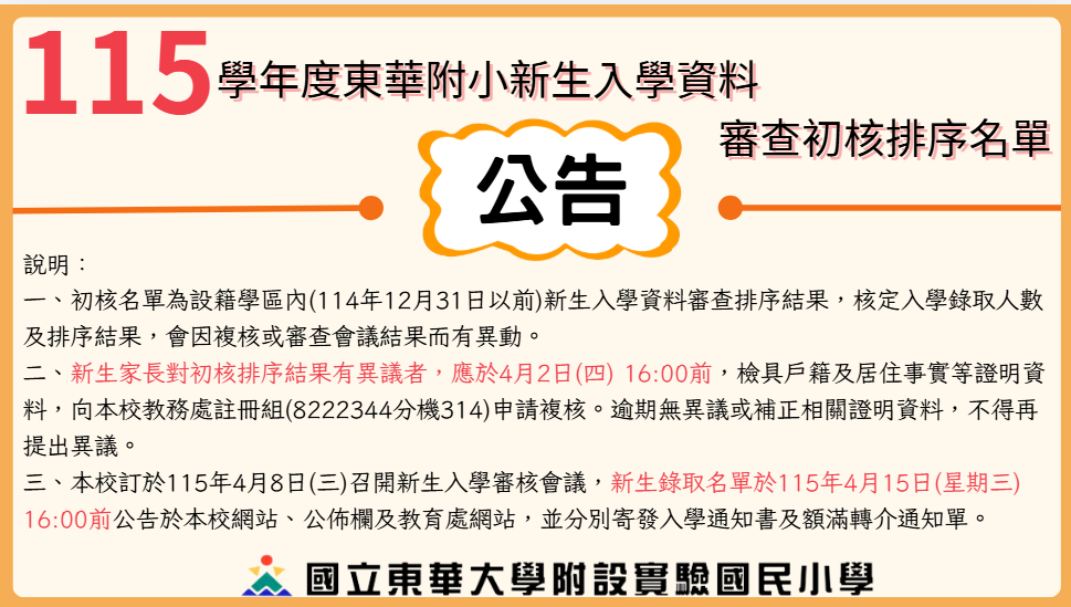 【公告】本校115學年度一年級新生入學資料審查初核排序名單Post author:efshlc314Post published:2026 年 3 月 31 日Post category:小一新生115學年東華附小-新生登記初核名單上傳校網下載 Post Views: 82相關內容【重要公告】本校114學年度一年級新生入學辦法及新生入學作業期程2025 年 2 月 17 日【公告】東華附小112學年度一年級新生家長開學須知2023 年 8 月 21 日【轉知】東華附小114學年度學區戶籍內新生人數超過可招收名額,爰公告本校為新生分發入學額滿學校。2025 年 2 月 4 日