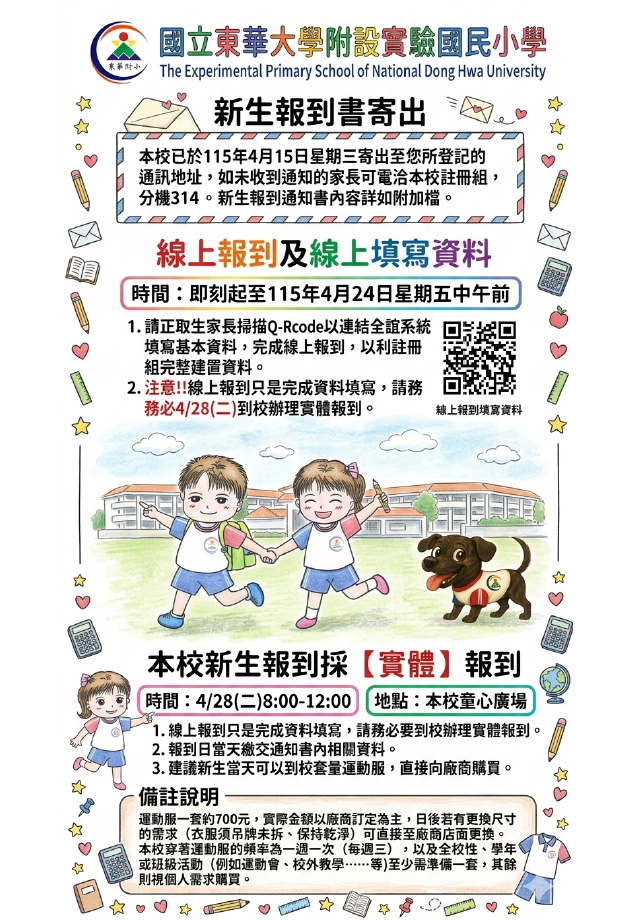 【公告】115學年度新生錄取通知書已寄發,請務必完成「線上填寫資料」與「新生報到」手續Post author:efshlc314Post published:2026 年 4 月 15 日Post category:小一新生 / 註冊組115新生報到相關事宜下載錄取生寄-115學年度-新生報到通知單-1下載錄取生寄-115學年度-新生基本資料空白表-2下載錄取生寄-115學年度-新生本土語言選修課程調查表-3下載錄取生寄-115學年度-新生代收代辦費家長意願調查表-4下載 Post Views: 45相關內容【來函轉知】財團法人核能與新能源教育研究協進會開張翠蓮女士清寒獎學金,自即日起至112年7月7日止(以郵戳為憑)受理申請。2023 年 6 月 10 日111學年度下學期一~五年級期末評量及六年級畢業考監試表暨注意事項2023 年 5 月 29 日113學年度下學期期末受獎名單暨彩排頒獎注意事項(教務處)2025 年 6 月 26 日